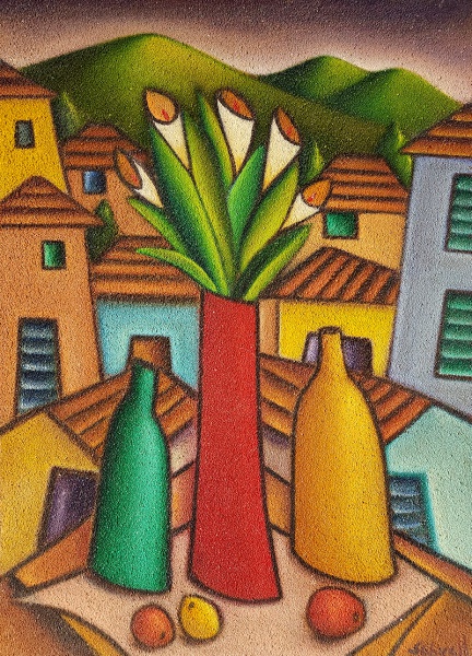 • FRANCISCO SOBRAL, Casa, vaso e garrafa - Oleo sobre eucatex - 60x43 cm - ACID e VERSO 2010